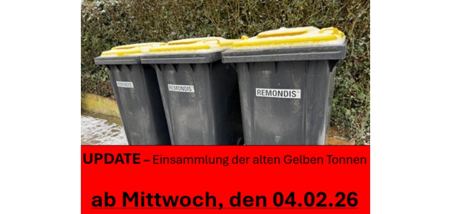UPDATE 03.02.2026 - wie von der REMONDIS GmbH & Co. KG mitgeteilt wurde, wird mit der Einsammlung der Gelben Tonnen bereits am Mittwoch, den 04. Februar 2026 begonnen. Stellen Sie bitte Ihre Tonne am Straßenrand bereits.