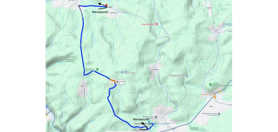 Taunusstein-Hahn „Am Schwimmbad" - Hahner Weg - K 700 - K 667 - Hohenstein-Breithardt – L 3373 - Hohenstein-Steckenroth – Wendepunkt - L3373 - Hohenstein-Breithardt - K 667 - K 700 - Hahner Weg (Wendepunkt) - Taunusstein-Hahn „Am Schwimmbad"